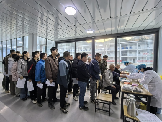 陣地前移,工地飄揚“健康紅”。為最大限度降低對工程建設進度的影響,同時保障項目職工健康體檢的權益。項目部巧妙盤活空間資源,將會議室、空閑庫房等區域科學改造為臨時“流動體檢站”。職工們在熟悉的工作環境中依次完成各項檢查,既避免了長途奔波的疲憊,也節省了寶貴的時間。職工們紛紛點贊:“下樓走幾步就能查身體,不誤工、不折騰,這服務實在!”